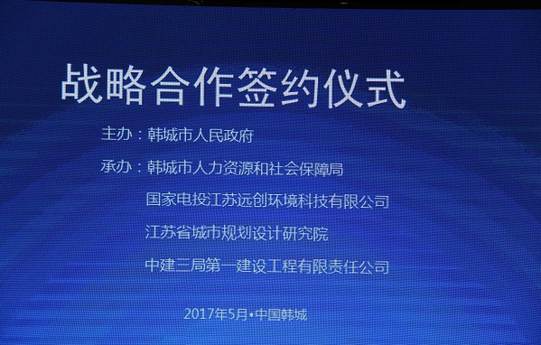 5月18日,由韩城市人民政府主办,韩城市人社局、国家电投远创环境科技有限公司、江苏省城市规划设计研究院、中建三局第一建设工程有限责任公司联合承办的中国·韩城战略合作签约仪式隆重举行。